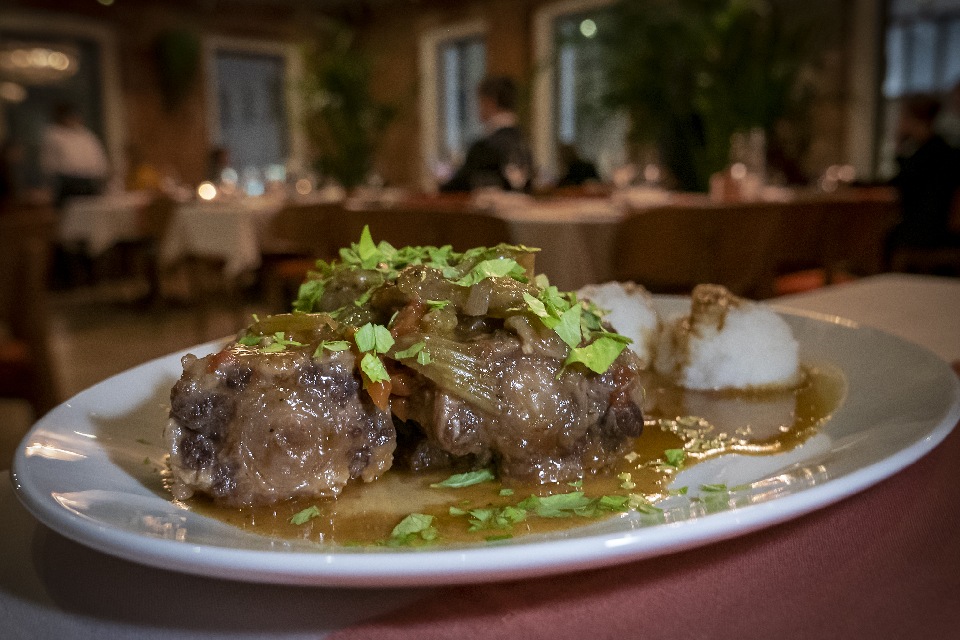 Еще одно блюдо, за которым стоит сюда вернуться, тушеные бычьи хвосты с полентой (1050). Еда сугубо мужская. Для тех мужчин, которые точно знают, что лучшее мясо всегда ближе к костям или хрящам. Да и полента, прямо скажем, тоже не женская еда. Никакого сексизма, честное слово.