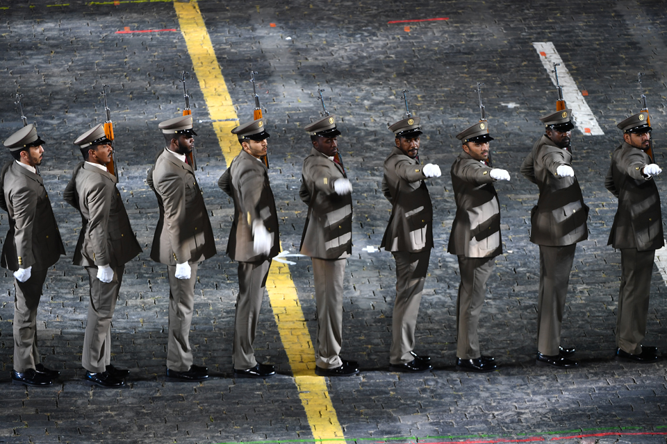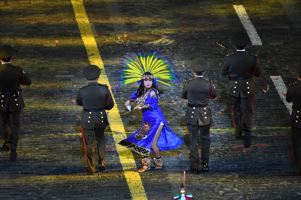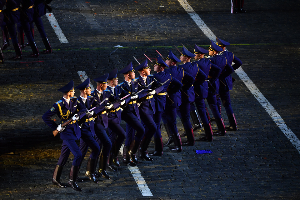 Открытие началось с фанфаров «Спасская башня» и барабанного боя. Первым к зрителям вышел Президентский оркестр Службы коменданта Московского Кремля ФСО России, а вместе с ним — рота специального караула президентского полка СКМК ФСО России.