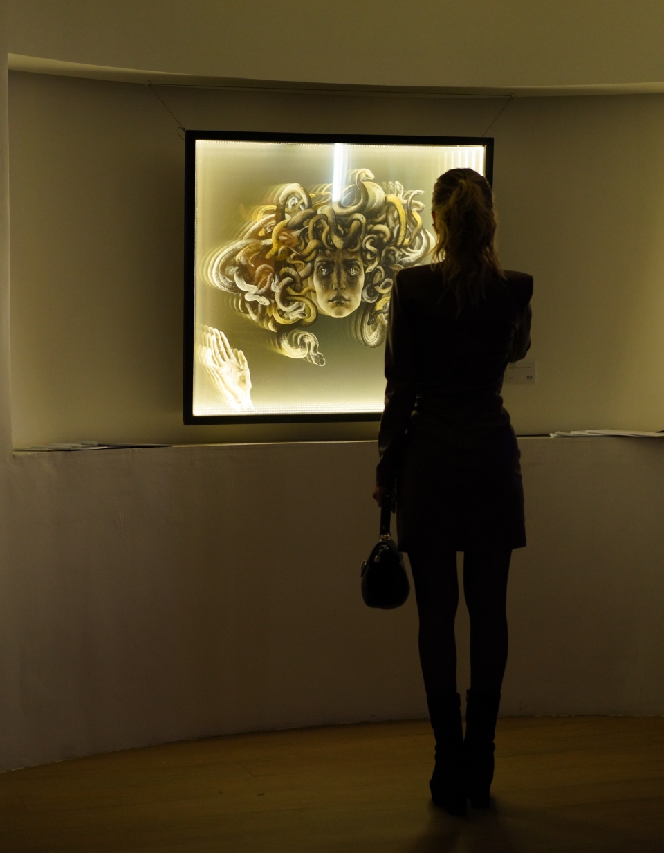 Гости увидели экспозицию, побыли наедине с ультрафиолетовыми полотнами в полной темноте и погрузились в атмосферу огней мегаполиса под звуки джазовой музыки и игры на арфе. Некоторые работы запомнились особенно. Например, «Фатум» питерского художника Ильи Крейдуна. Эта картина вдохновлена образом мифологического образа Медузы Горгоны – змееголовой женщины, превращающей людей в камень. Художник выполнил работу в смешанной технике и поместил ее в зеркало с подсветкой. Так Горгона буквально оживает на глазах зрителей, проецируясь в бесконечном пространстве зеркал.