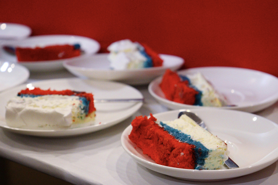 Центральным элементом акции стал десерт, состоящий из трех слоев: красный бисквит, синяя сердцевина из грушевого пюре и верхний завершающий слой — сливочный мусс с белым шоколадом.