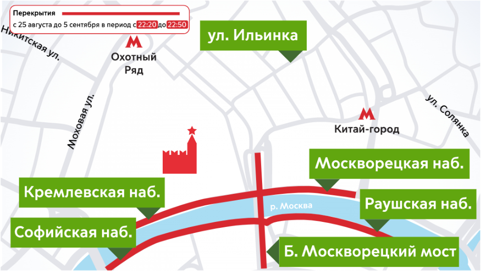 С 25 августа до 5 сентября с 22.20 до 22.50 – на Кремлевской, Софийской, Москворецкой, Раушской набережной, а также Большом Москворецком мосту.
