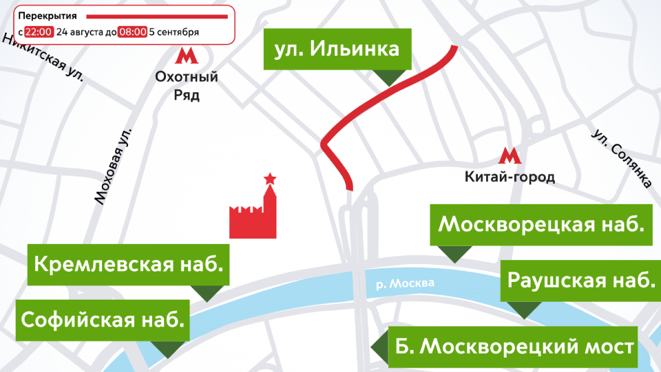 В частности, проезд будет закрыт с 22.00 24 августа до 08.00 5 сентября на ул. Ильинка и в проезде в районе дома №5 по Красной площади.