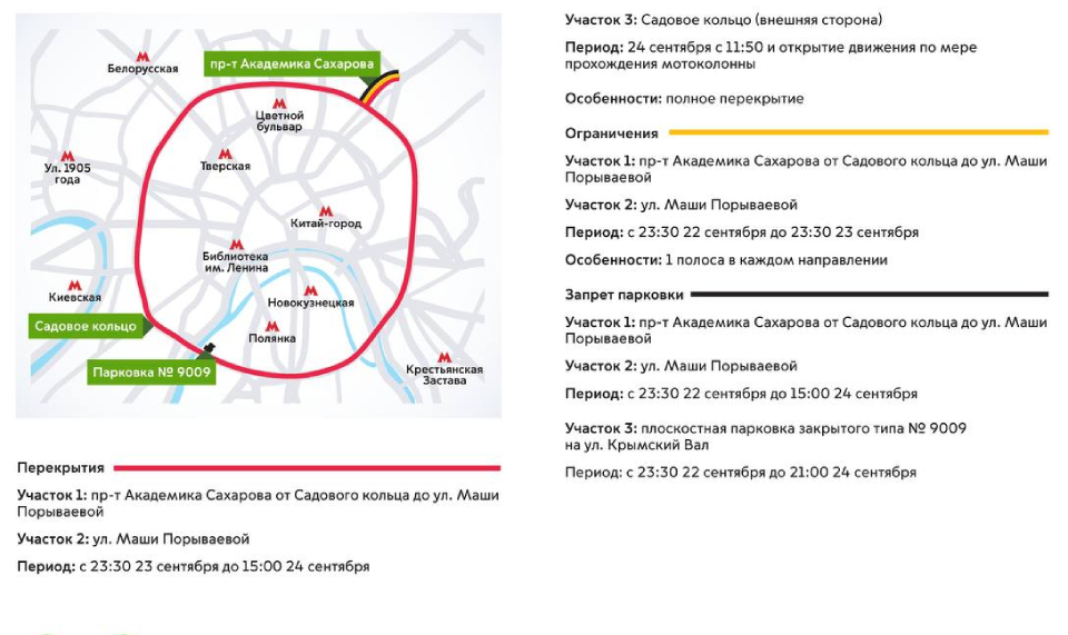 24 сентября, с 11.50 проехать нельзя будет по внешней стороне Садового кольца. Движение обещают открыть по мере прохождения колонны мотоциклистов.