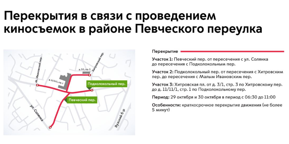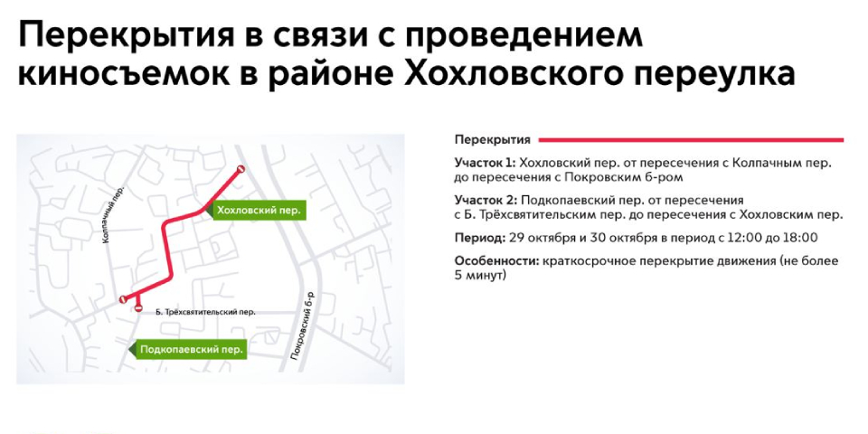 С 12:00 до 18:00 для проезда закроют несколько кварталов в районе Хохловского переулка. Перекрытие будет краткосрочным, не более 5 минут: