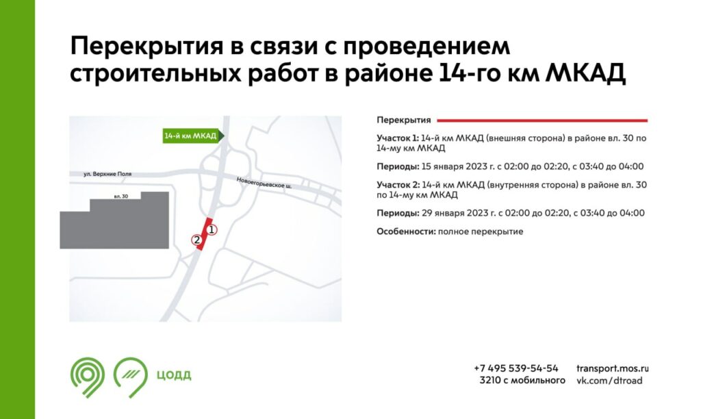15 января 2023 года в Москве перекроют участок внешней стороны 14-го километра МКАД. По нему нельзя будет проехать с 02:00 до 02:20, затем с 03:40 до 04:00. А 29 января ограничения коснутся уже внутренней стороны 14-го км и продлятся также с 02:00 до 02:20 и с 03:40 до 04:00. Перекрытия связаны со строительными работами на этих участках. Водителей просят заранее прорабатывать свой маршрут с учетом изменений.