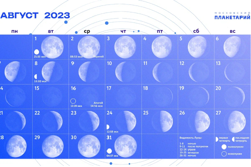 В августе «Голубая Луна» покажется на небе 31 числа. К тому же, в этот день она приблизится к Земле на расстояние ближе 362 000 километров. Такое явление называют Суперлунием, а значит 31 августа можно будет наблюдать Голубую Суперлуну – самую большую полную Луну 2023 года. Главное, чтобы была ясная погода.