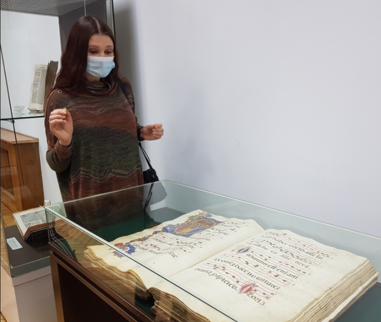— Богослужебная певческая книга называется «градуал». Она содержит тексты и ноты песнопений к различным праздникам. Издание такого крупного формата предназначались для хора певчих. О цкрковных праздниках говорят инициалы и изображения. В 1866 году эта рукопись была приобретена князем Д.С. Горчаковым и находилась в его библиотеке в имении Барятино, — рассказала сотрудница РГБ.