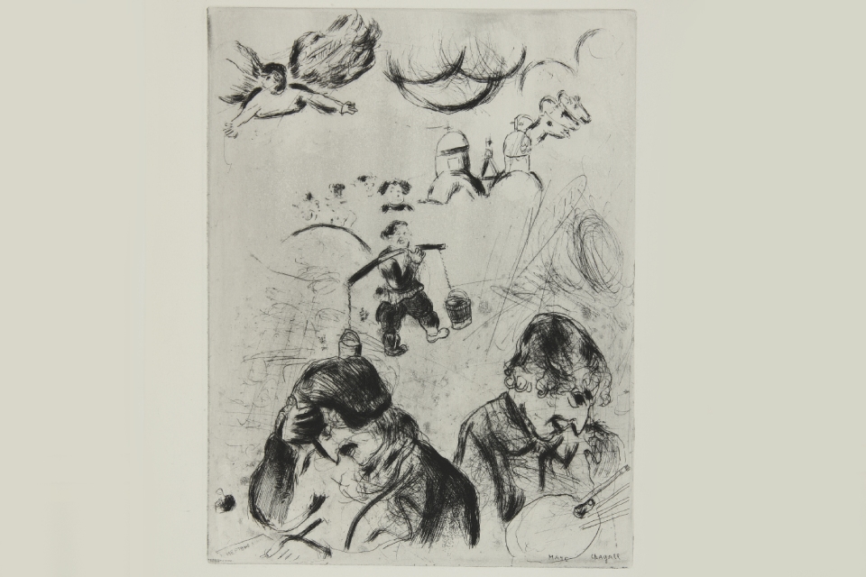 Выставка включает и уникальный раздел, посвящённый «позднему русскому следу» в творчестве художника: иллюстрациям к поэме Николая Гоголя «Мёртвые души», созданным в 1923–1926 годах, уже после отъезда Шагала из России. Эти работы наполнены выраженной ностальгией по Родине.