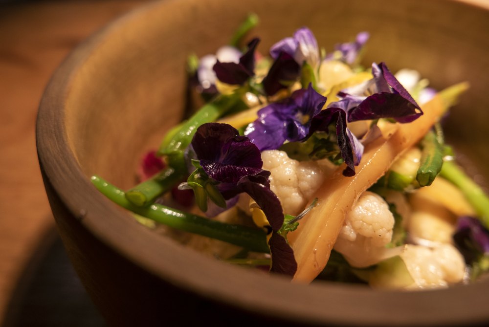 Ну а уж репа — это сугубо наше. Тут она квашеная, тончайше нарезанная и свернутая на манер розы (560). Лепестки мягкие, маринад деликатный. В продолжение цветочной темы — кадушка цветов и юных овощей (980). Есть салат не просто из редьки, а из двух видов редьки — обычной зеленой и арбузной, да еще и с моченым яблоком (480). Ну и, само собой, суточные щи с белыми грибами (480).