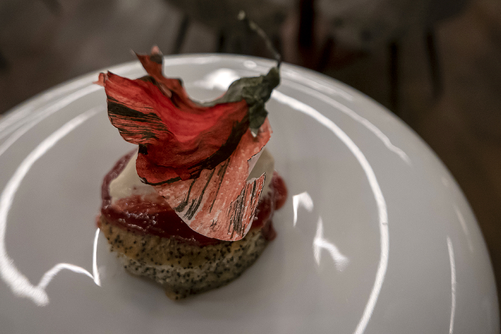 Десерт «Мак» (500) и правда с маком (плюс мороженое из иван-чая и сложносочиненное варенье), а сверху — вручную раскрашенный цветок из вафельной бумаги. Под него на всякий случай хочется граппы. В общем, тот еще у меня пост, настоящее испытание силы воли. Но молодец, удержался от соблазнов.