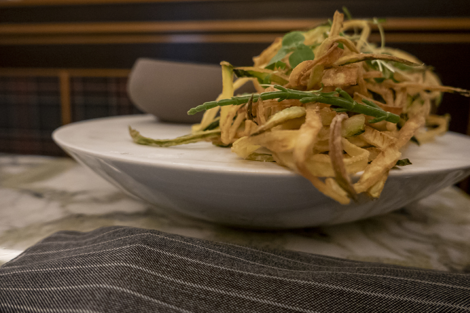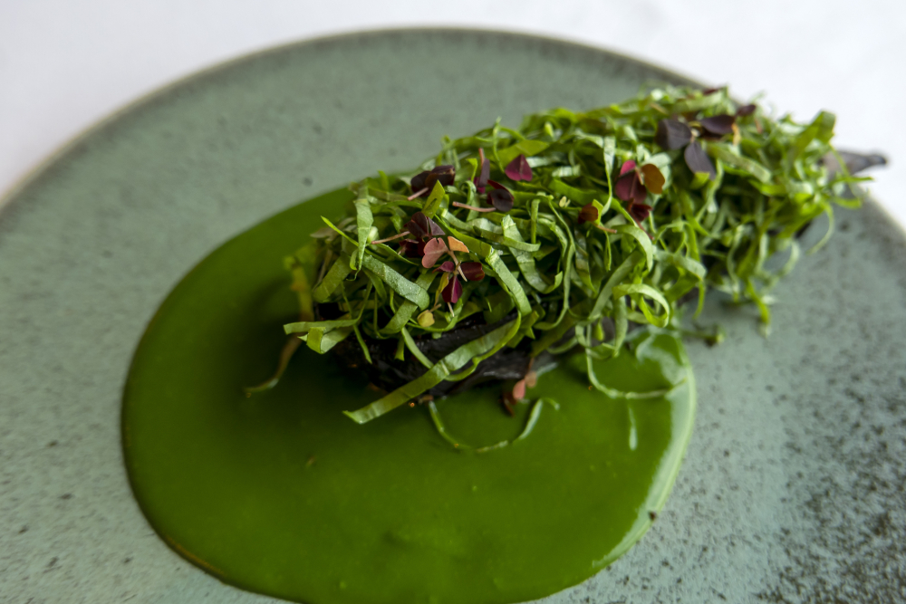 С запеченным баклажаном (400 р) в этом смысле проще — съедается практически без остатка, вместе со щавелем и соусом из шпината и молочного улуна. От драника из картофеля и топинамбура (650) вообще ничего не остается. Здесь соус из корня сельдерея и юзу (а не сметана какая-нибудь скоромная) и устричный лист впридачу.