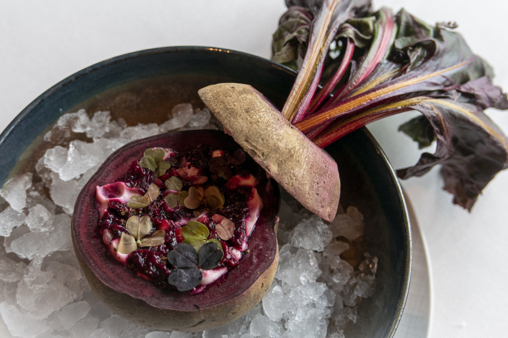 Самое интересное тут, пожалуй, вяленая свекла со сметаной из кокосового молока, малиной и кислицей (450 р). Причем на вкус это именно то, что указано в описании, каждый ингредиент ощутим. Боюсь, правда, за это блюдо сторонники идеи zero waste съедят Викентьева с потрохами: там много красивого, но несъедобного. Надо срочно выпустить пресс-релиз, поясняющий, что жесткая часть свеклы и ботва идут в переработку и потом из них изготавливают какой-нибудь целебный жмых для прокорма бездомных белок.