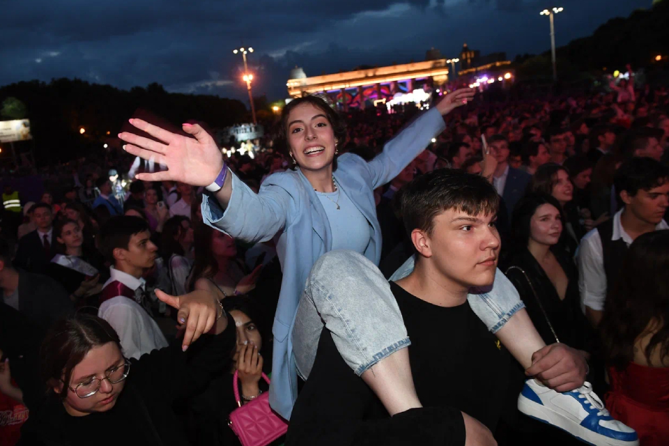 Завершился выпускной в романтическом ключе — наставлением от ведущих: «И теперь, когда все экзамены сданы, перед новыми взрослыми людьми встает лишь один главный экзамен — на любовь».