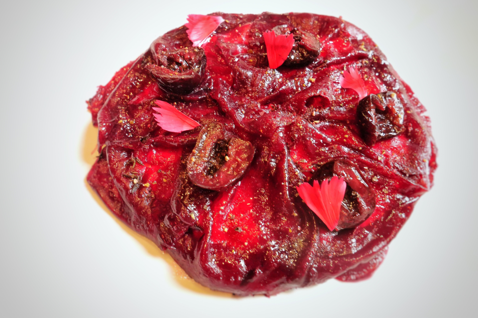 Много русской классики — от солений и пирожков до солянки и судачков. На роль signature dish явно тянет килька с томатами. Но это немного другая килька с томатами. Тонкое килечное филе уложено на маринованные помидорчики-черри без кожицы и сдобрено петрушечным маслом. Со стороны иногда напоминает стайку дельфинов, выгнувших спины над морской гладью (да, вот такой я романтик). Пшенная каша с крабом и маслом апельсина — это не так оригинально (сейчас все про каши вспомнили), но вкусно. Очень интересная штука — страчателла на миндальном муссе, поверх которой выложены лепестки вяленой свеклы и вяленая же черешня. Можно как закуску или на десерт.