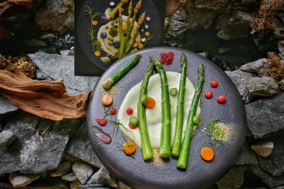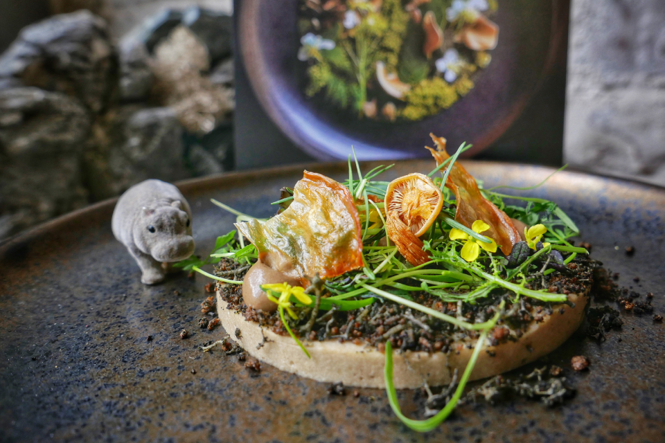 Вот полное меню: 1. Океанический восторг с хрустящими водорослями (сырая креветка, красный лук, зелень, сок лайма, майонез, горчица, водоросли). 2. Серф энд торф в северном стиле с садовыми травами (оленина, ягодный соус, хрустящие листья кейла). 3. Урожай северного сада с землистыми грибами (грибы шиитаке и портобелло, дикий чеснок, сморчки, шпинат, сливки). 4. Блаженство из спаржи с ягодным твистом (бланшированная спаржа, сырный крем, ягоды). 5. Наслаждение фьордовой форелью (копченая форель, сливки, сметана, маринованные овощи). 6. Рулет «Пир в лесу» (мясо нутрии в винном соусе с травами). 7. Очарование на берегу северного озера (мусс из белого шоколалда с хрустящей крошкой из кукурузной муки).