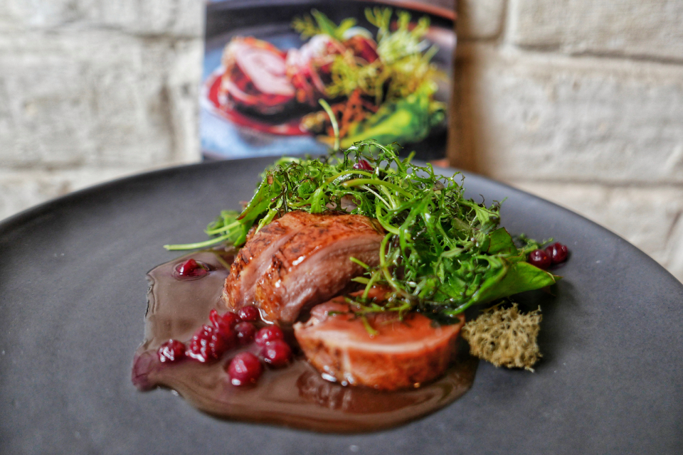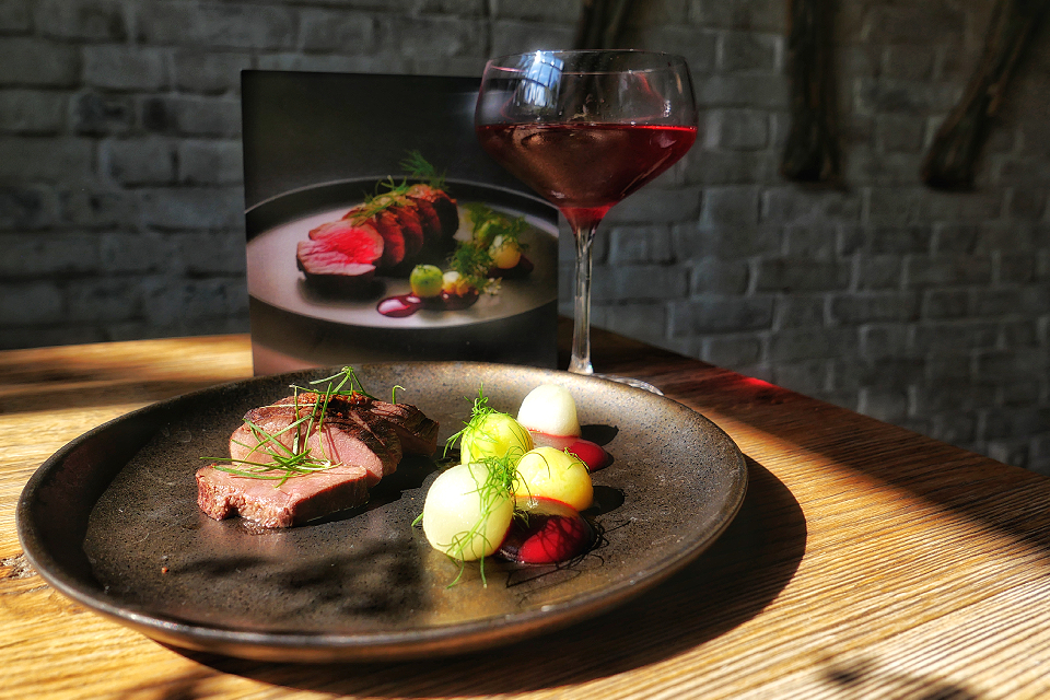 К каждому блюду не только подробнейший рецепт (все довольно сложные), но и картинка — как блюдо должно выглядеть в готовом виде. На картинки повара равнялись вплоть до мельчайших деталей, получилось похоже. А вот в рецептах позволили себе некоторые вольности: решили, допустим, что в первом курсе не помешал бы морской виноград — добавили; решили, что вместо оленя лучше подойдет косуля — заменили. Но в основном все, как велели нейросети.