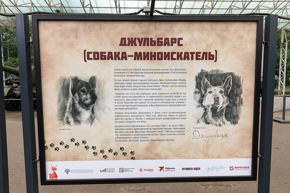 Выставка «Четвероногие герои» приурочена ко Дню фронтовой собаки, который был учрежден Музеем Победы в 2017 году в память о подвиге овчарки Дины, совершившей диверсию 19 августа 1943 года. Узнать о том, какой вклад в Победу внесли военные собаки можно до 29 августа.