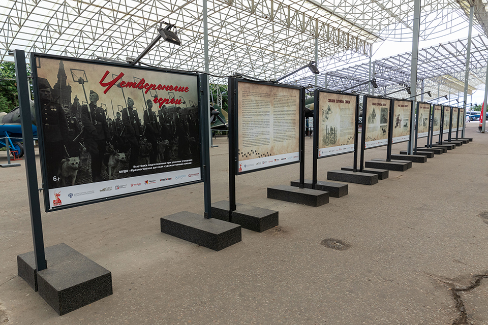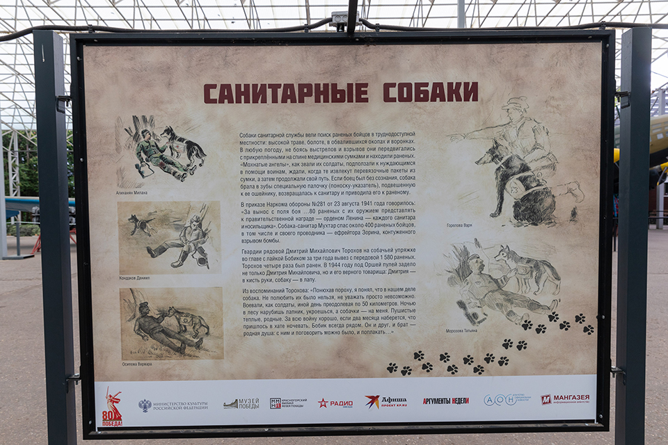 В рамках выставки посетителям расскажут о различных видах службы собак: санитарной, противотанковой, ездово-нартовой, минно-розыскной, разведывательной, диверсионной и службе связи. Экспозиция демонстрирует значительный вклад собак в Победу. На стендах записаны удивительные истории, о том, как собаки подрывали танки и эшелоны, вывозили раненых, доставляли донесения и находили мины. Всего, по данным Музея Победы, более 60 тысяч собак прошли боевой путь от Москвы до Берлина.