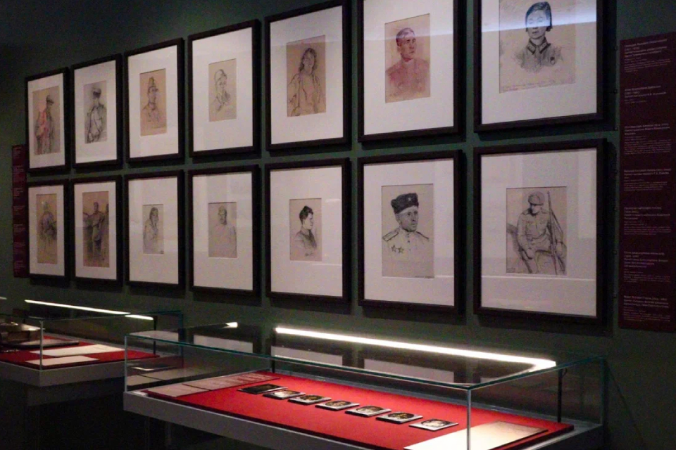 В экспозиции представлена галерея портретов бойцов Великой Отечественной войны из разных подразделений. Эскизы созданы военными художниками, сослуживцами изображённых.