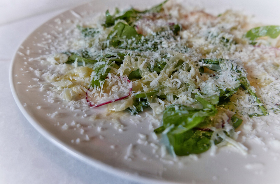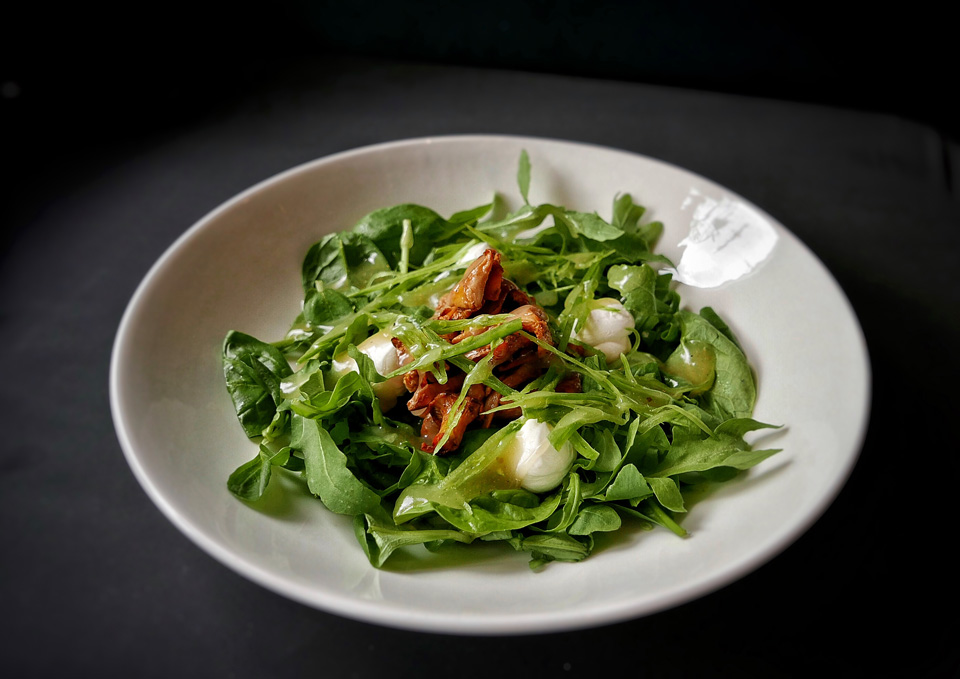 Салат с лисичками — взят исключительно из уважения к красивому обычаю в сезон лисичек именно лисички и есть. А вот тут сыр уже мягкий, практически кремовый, работает не столько с грибами, сколько с салатной зеленью. Кстати, там еще упоминается молодой горошек, но вы его, скорее всего, не увидите. Я вот не увидел. А он там есть. Просто это совсем молодой горошек, тоненький, как соломка, с крохотными зернышками внутри — мне специально принесли на блюдечке показать.
