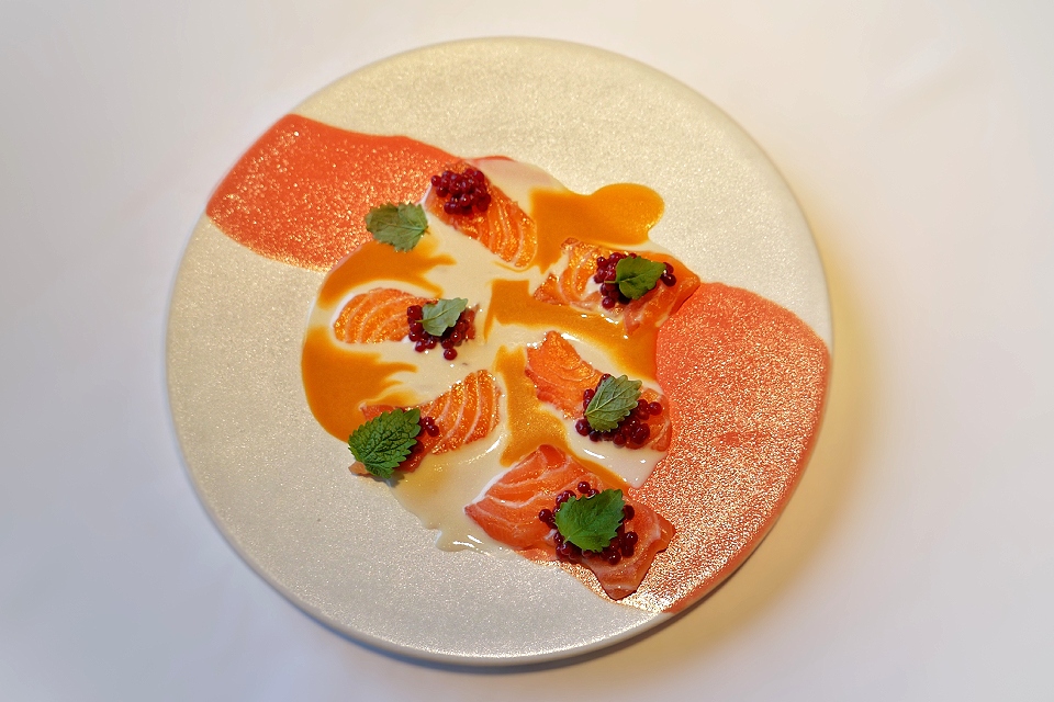 Лосось с кремом из креветки, ряженка (в ней немного хрена) и микро-шарики малинового желе, похожие с виду на бруснику. И удивительным образом подходящая по цветовой гамме тарелка. То ли ее под блюдо заказывали, то ли под тарелку блюдо придумано.