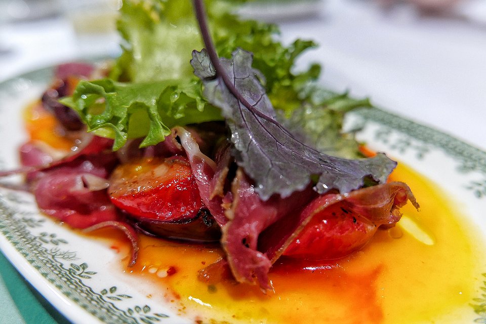 Отдельно про хамон из утки с сезонными фруктами (350). В день моего визита был разгар сезона слив, и они были прекрасны, как и хамон. Но вот абрикосовый соус с лимонным соком и имбирем лично мне понравился чрезвычайно, а спутнице показался излишне кислым. Дело вкуса, конечно, но все же эту закуску лучше бы перенести из раздела «Под вино и шампанское» в раздел «Салаты и закуски» — с таким соусом ни одно вино не справится. А, например, деликатнейший картофельный гратен с трюфелем и пармезаном (780) со многими винами подружится, вот его бы в винный раздел и пристроить на место хамона.