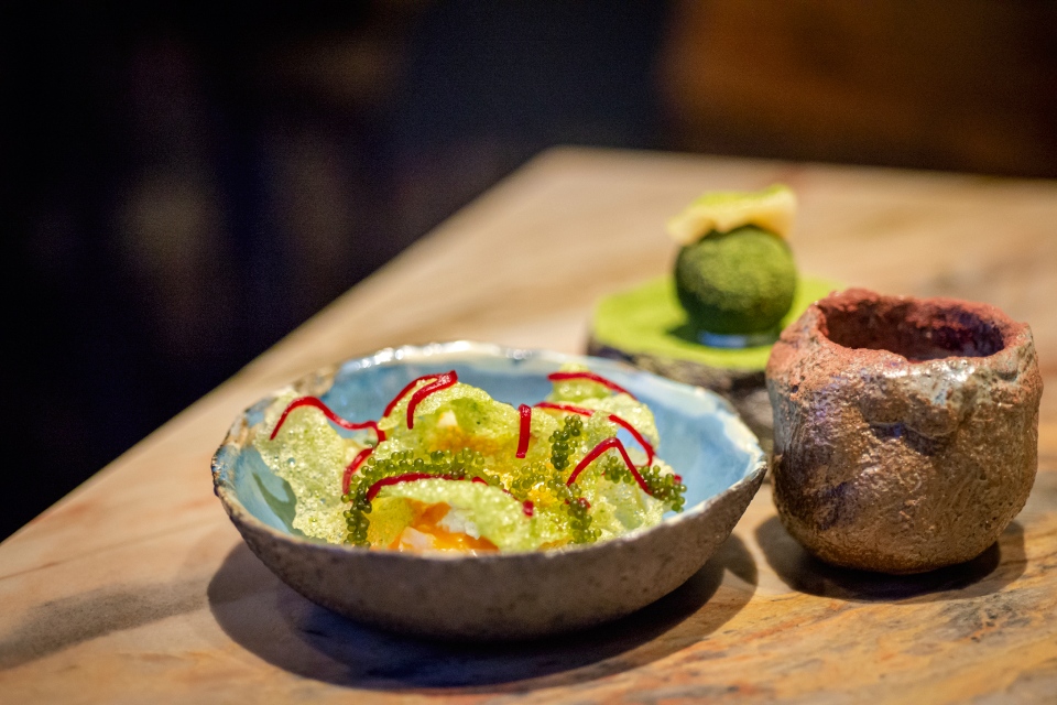 Оригинальная посуда (вот для чего, видимо, им тут нужен гончар) и столовые приборы. Мастерски составленное винное сопровождение (впрочем, есть и безалкогольная версия). Ну и еще невероятной красоты бар с очень концептуальной картой коктейлей. В него, кстати, в отличие от основного зала ресторана, можно попасть без сильно заблаговременного планирования и неплохо перекусить (в меню даже есть кое-что из дегустационного сета). Но о баре надо будет как-нибудь отдельно рассказать.