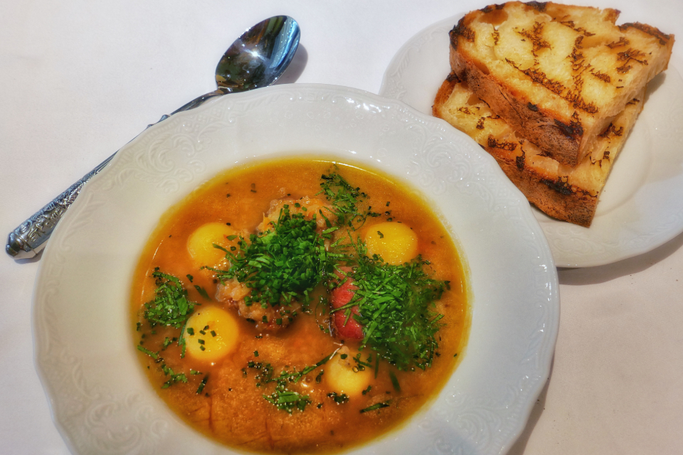 Если надумаете взять pommes dauphine (а взять их стоит), имейте в виду: весьма сытно, но зато и безумно вкусно: картофельные палочки в тонкой хрустящей корочке — это нечто. В разделе супов раздолье: тут тебе и буйабес, и консоме, и вишисуаз… А вы возьмите кислые щи с копченой грудинкой — и горя знать не будете. После них хочется развернуться лицом к России и заказать щучью котлету со щучьей же икрой и зеленым «ризотто» из риса, булгура и киноа или пельмени с мраморным мясом. Хотя можно, конечно, и турнедо Россини, к нему тоже вопросов нет.