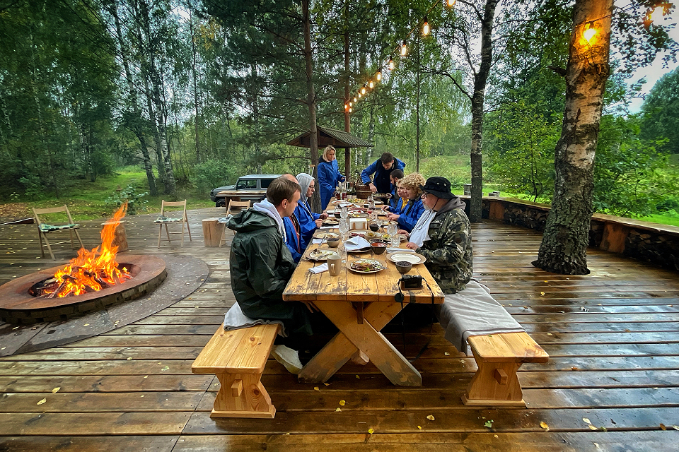 В следующем году тут построят несколько гостевых домиков, можно будет отдыхать по полной — гулять по лесу, собирать грибы/ягоды. Периодически будете натыкаться то на избушку (чайку попить), то на поляну с шатром и мангалом (перекусить более основательно, а то и поужинать на свежем воздухе, если погода позволяет). Основная еда, конечно, в ресторане — там уже и принарядиться к ужину можно, и дату какую-нибудь в приятной компании отметить.