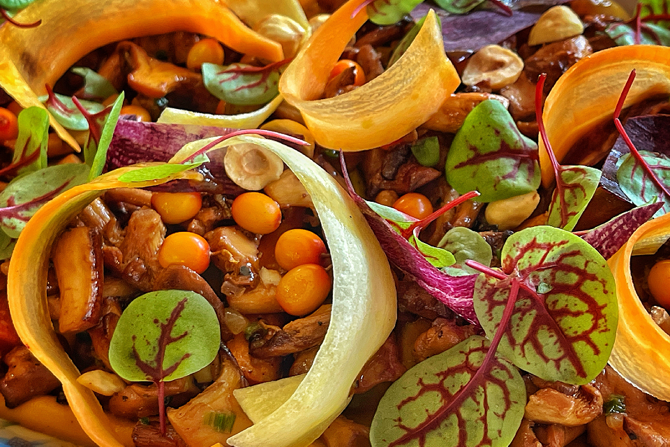 При этом никакого копирования Twins Garden. Еда тут будет совсем другая — гораздо более простая, вся из здешних продуктов, но тоже, разумеется, с выдумкой. У нас на обед были цыплячьи грудки, котлеты из рыбы, выловленной в окрестных речках, соленые огурцы, грибы, множество разных овощей, салат из разноцветной моркови с грибами, облепихой и фундуком, а вечером у костра были поданы перепелки с грибами и птитимом и томленая ягнятина (вот ягнятина не своя, но братья так довольны нынешним поставщиком, что о своем стаде даже и не помышляют).