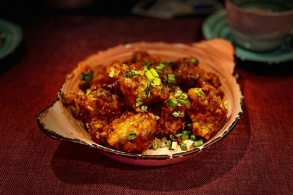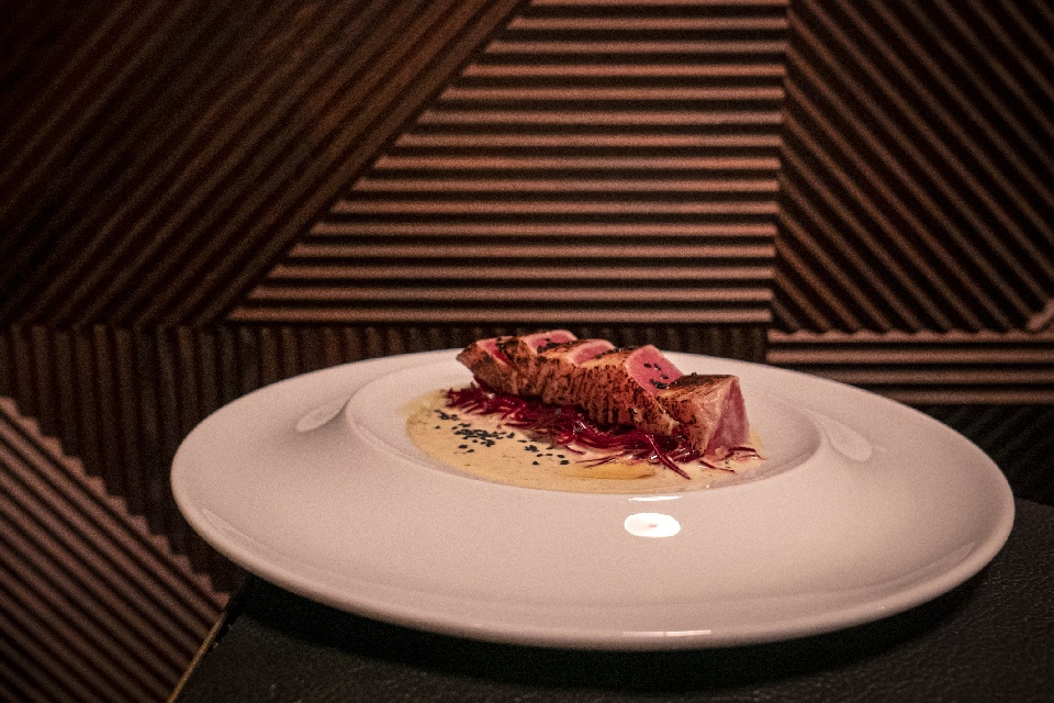 Первым делом надо заказать татаки из тунца, подмаринованного в соусе шисо (780). Причем главное тут не сам тунец (хотя вопросов в нему нет, выполнено все на уровне), а «спагетти» из свеклы с васаби и кунжутом. Их хоть отдельно подавай. Потому что если их подавать с чем-то, они перекрывают собой основное блюдо. Вот и тунца чуть не перекрыли. Но без тунца вы их вообще не попробуете, так что берите.