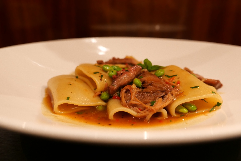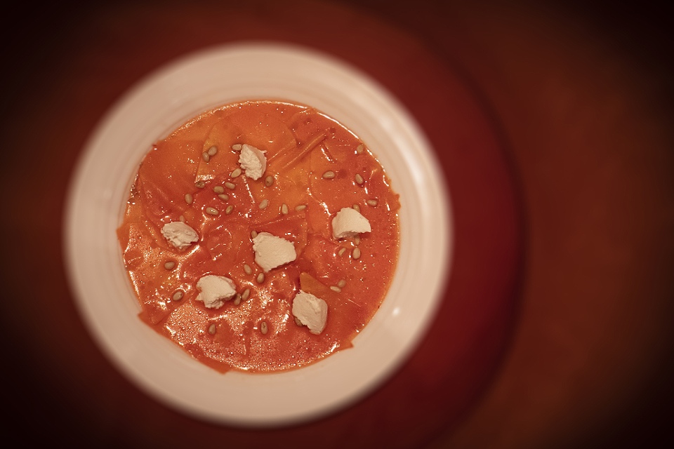 Главный шедевр – карпаччо из тыквы, подмаринованной в соке красных апельсинов с кедровыми орешками и козьим сыром (420). Брать не раздумывая. Канноли с крабом (980) тоже брать. В виде оболочки тут выступает тончайшая рисовая лепешка, а к мясу краба добавлено еще и яблоко. Плюс соус юдзу (вот они, неброские приметы обновления).