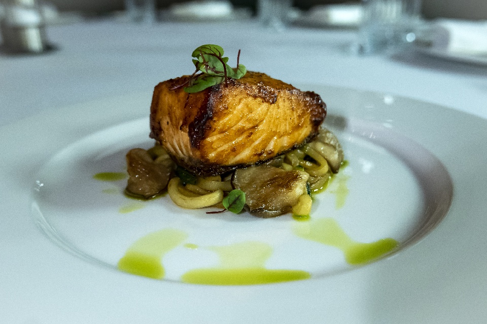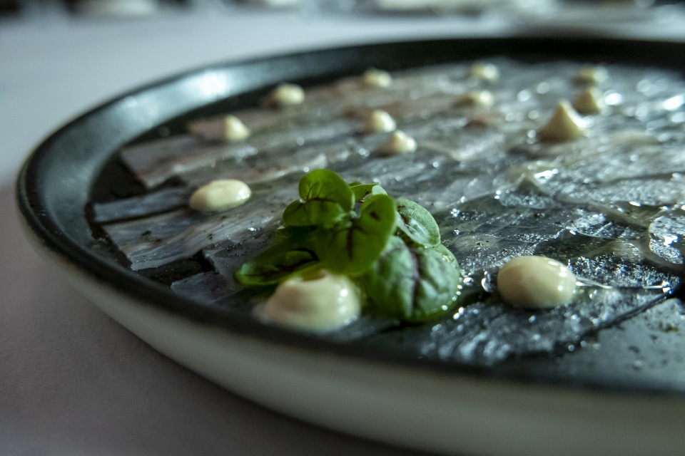 Еда предсказуемо изысканная и элегантная, под стать общей обстановке. Исполнение — высококлассное. Уж если карпаччо из сибаса (1200 р), то толщиной с лист папиросной бумаги. И разумеется, с трюфельным понзу. Буррата с томленой в вине грушей (1290), террин из стерляди и лосося (900), тирадито из лосося в свекле в соусе из макакуйи (1500). И это мы пока только в разделе холодных закусок. (Не волнуйтесь, гости дорогие, фуагра тоже есть).