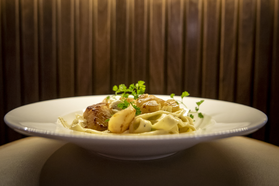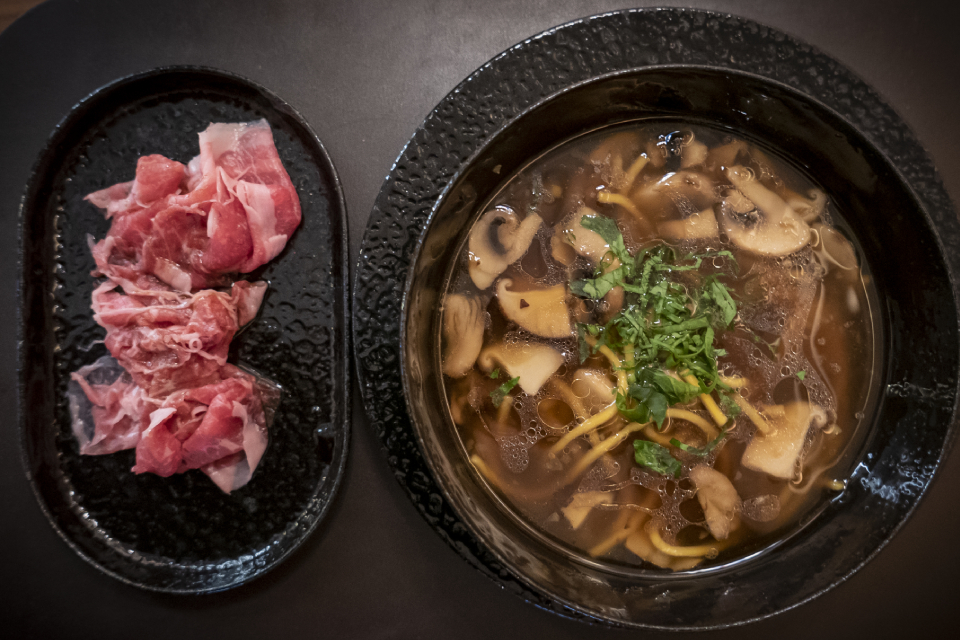 Брать: 1. Азиатский суп с лапшой и грибами (450 р), к которому подают нарезанную тончайшими лепестками маринованную говяжью грудинку (кладем ее в горячий суп, она там доваривается — ну типа как говядина в фо бо); 2. Буррату с хурмой (600). 3. Папарделле cacio e pepe c жареными гребешками (610) — такого вкусного перца я давно не ел, но кого-то, возможно, стоит предупреждать: остро. 4. Томленую грудинку с кремом из сельдерея (980).