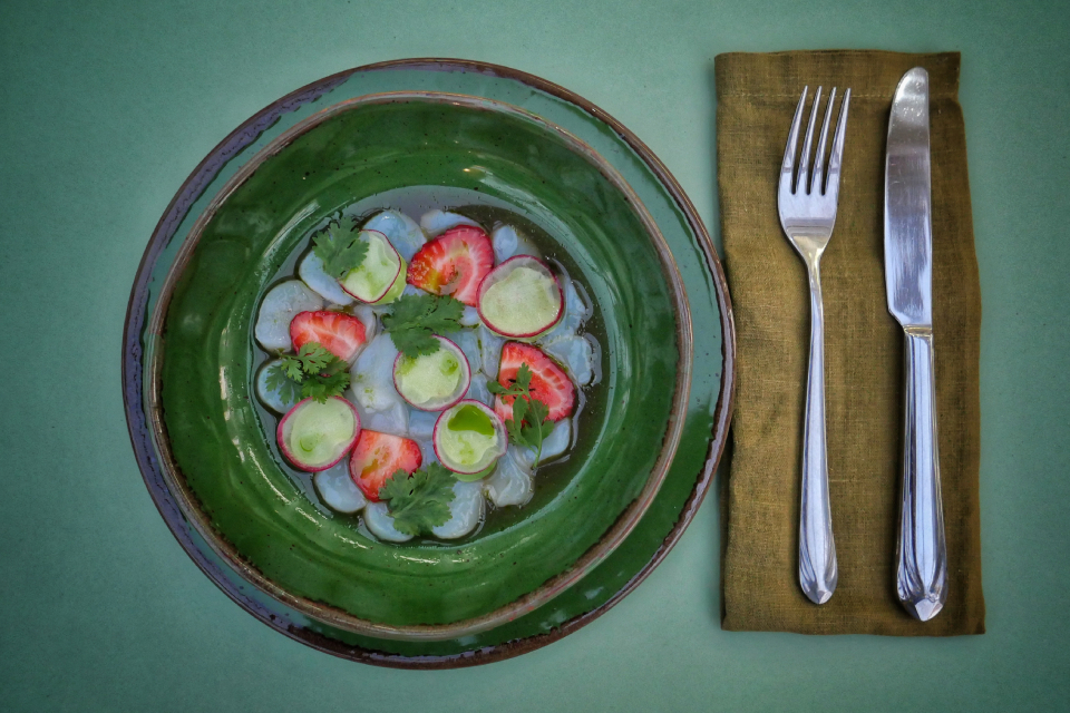 Какая тут кухня, сразу не скажешь. Разная кухня, с летним и восточным уклоном (посмотрим, что будет в другие сезоны). Много магрибских специй, от которых узбекский павильон начинает напоминать марокканскую виллу на берегу моря. Но есть и другие географические акценты. Очень красивый и легкий гребешок с редисом, клубникой и шисо. Прямо аперитив какой-то. Печеный баклажан с мисо. Жареный халуми с грушей. Пончики сейчас где только не подают, но у этих внутри – крабовая фрикаделька. Молодая капуста тоже с крабом и соусом берблан. Приятная такая капуста. Но больше всего понравились почти невесомые ньокки с лисичками и страчателлой, хотя правильнее было бы сказать – страчателла с лисичками и ньокки.