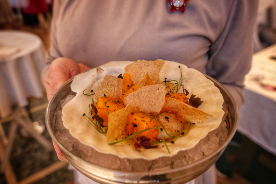 Для подачи с кроликом и «ризотто» из перловой каши кубики хурмы обжигают. «Ризотто» — отлично (все как надо по классике — шалот, белое вино, сливочное масло, пармезан), а вот кролик скучноват, не хватает ему сочности (хотя откуда ей в кролике взяться?). Обратная история с палтусом — его сопровождает растопленное сливочное масло с добавлением семян бурбонской ванили. Вкус — обалденный, а вот количество масла можно бы и уменьшить.