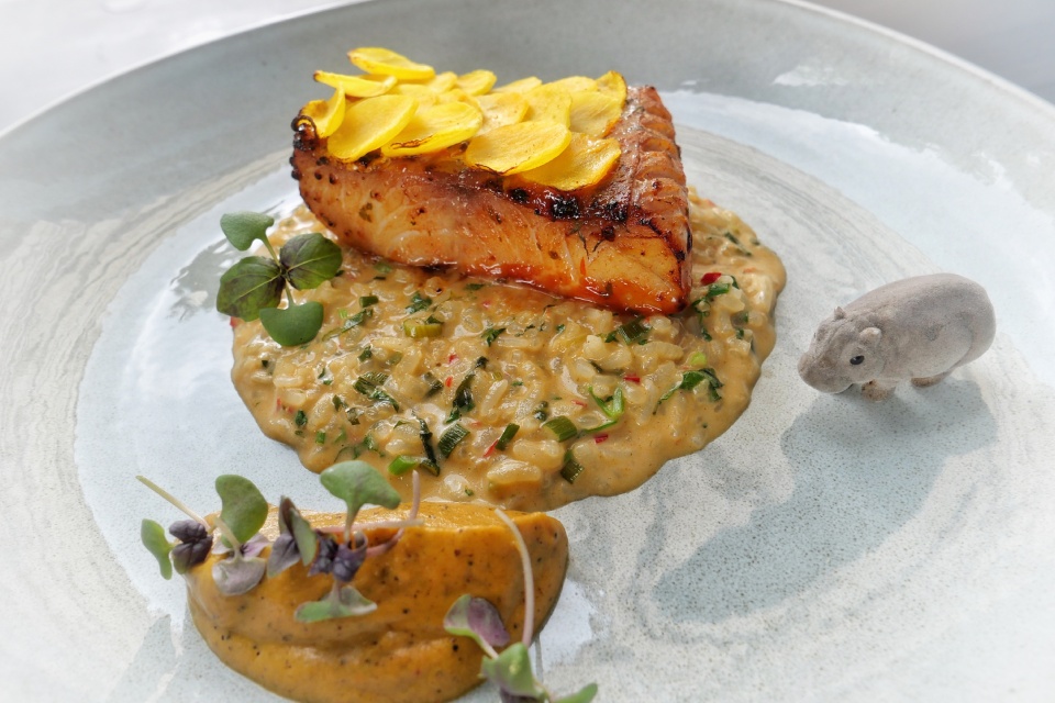 Филе барамунди сопровождается дивным ризотто в стиле том ям. Его, пожалуй, можно использовать в качестве гарнира и к другим блюдам. Маринованный в коджи рибай хорош, но в летнее меню все же не вписывается — тяжеловат он для жаркой погоды. Ближе в концу попробуйте втереться в доверие к персоналу и договориться, чтобы десерт вам вынесла шеф-кондитер Даша, она прехорошенькая. И десерты у нее прекрасные, особенно шу маракуйя, там даже есть таитянская ваниль. Где еще доведется такое попробовать?