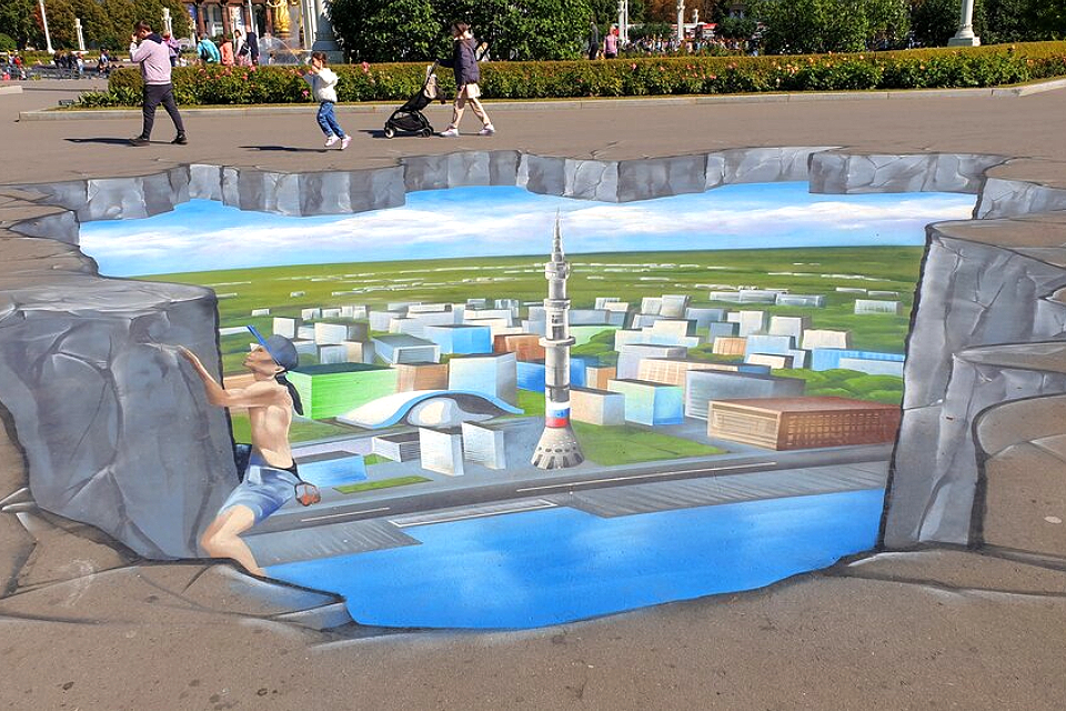 10 сентября 2022 в честь Дня города на ВДНХ прошел фестиваль «Путешествие в красках». Уличные художники работали в технике мадоннари (само слово из итальянского языка, в 16 веке во время праздников мастера рисовали на улицах Мадонну с младенцем). Суть техники: выдать такой стрит-арт, чтобы под определенным углом изображение смотрелось объемным. Как на этом фото: тротуар вдруг превращается в горную расщелину, с пиков которой открывается вид на Москву.