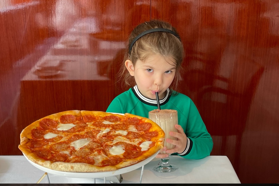 Дегустация детского меню в Rake. Подумал, что сам в этом ничего не пойму, пригласил в качестве эксперта девочку Лиду четырех лет от роду. Некоторые выводы. Первым делом дети делают стойку на то, что уже знают и любят. Пицца пепперони пошла влет. Следом – молочный коктейль с конфетками m&m’s. Дальше уже приходится объяснять. Например, что батат фри – это как картошка фри, но оранжевого цвета. Девочка съела и одобрила.
