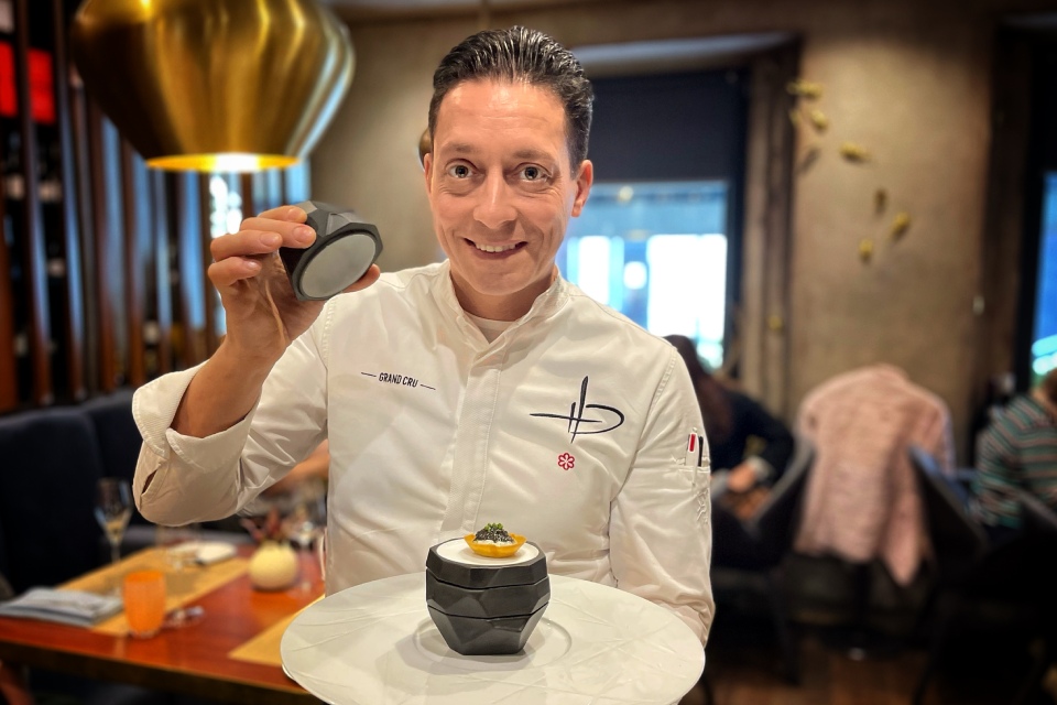 Поглядите-ка, какой изящный и миниатюрный сет придумал Давид Эммерле в Grand Cru. Называется Pépites Menu. «Трилогия гребешок», – шампанское».