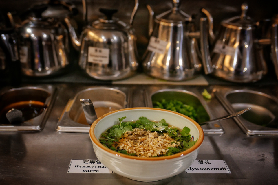Кухня сычуаньская без намеков на адаптацию, иногда так остро, что у девушек начинает течь тушь. Хорошо прийти компанией и взять хого (он же огненный котел, он же китайский самовар). Двойной хого — это когда в котелке булькают два вида бульона, острый и не острый. Опускать туда можно овощи, грибы, говядину, креветок, сгущенную утиную кровь, рубец, бекон, тофу и даже кусочки бычьего пениса (его тут застенчиво называют «бычий корень»). На вкус он так себе, но как тема для проявления остроумия в застольных беседах — самое то.