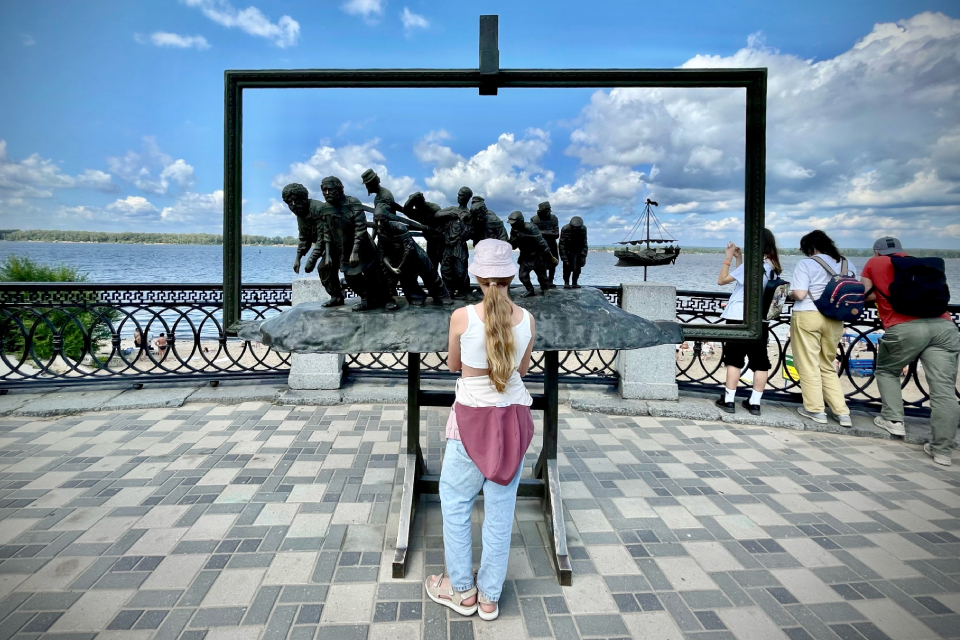Снова на набережную (в Самаре это неизбежно). Осматриваем скульптурную версию знаменитой картины Репина «Бурлаки на Волге». Некоторым нравится даже больше, чем сама картина — характеры выпуклые, много воздуха, а фоном — настоящее небо и настоящая Волга.