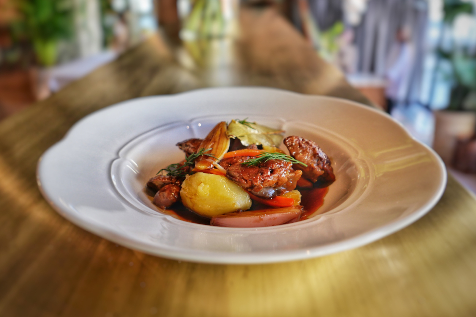 Место совсем молодое, по некоторым деталям это заметно: бокалы пока одинаковые для всех видов вина, да и по кухне есть вопросы: отличные маринованные перцы зачем-то уложены на подушку из сливочного масла с зеленью, «робюшоновское» пюре на самом деле не такое уж робюшоновское, тут масла маловато. Но зато прилагающиеся к нему томленые щечки очень даже хороши. И печень с овощами тоже.