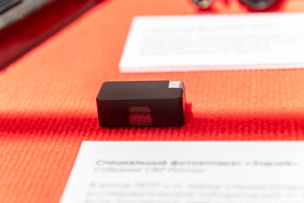 Миниатюрные фотоаппараты (один из них — «Зодчий» — размером не больше спичечного коробка). Подставка для ног, в которой хранились плёнки с отснятыми документами. Отвёртка, способная вызвать оперативного работника на экстренную встречу. Огнетушитель, в котором перевозили деньги через границу. Тайники, хитрые ежедневники, шифровки и многое другое. То, что мы обычно привыкли видеть в приключенческих фильмах.