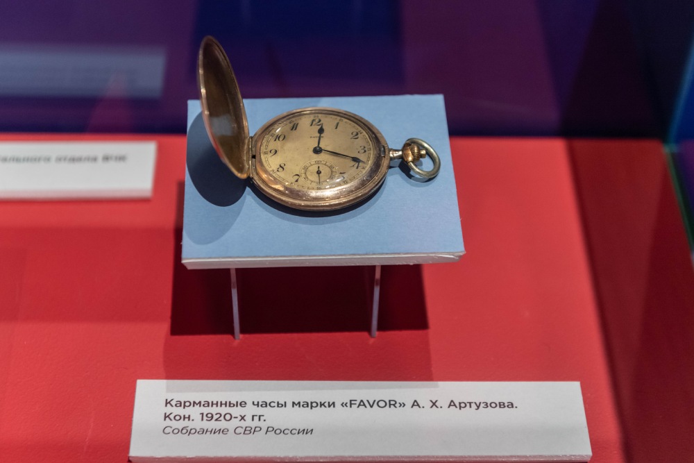 Дальше. Карманные часы одного из основателей советской разведки Артура Артузова. Круглые. Швейцарские. Марки «Favor». Передняя крышка открывается нажатием кнопки. На циферблате — двадцать минут первого. Точнее, девятнадцать. Разведчики время не округляют. А тот, кто может с ним вольно обращаться, счастливый человек. Это не я, это Штирлиц сказал. Я бы так не смог.