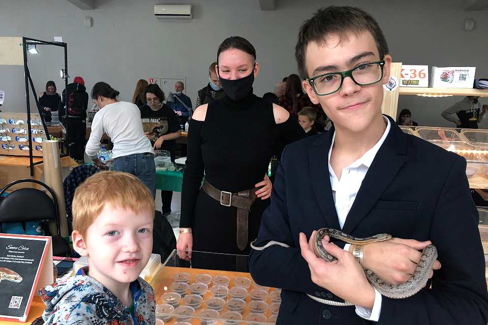 На втором этаже в изобилии змеи. В этом году заводчики пресмыкающихся привезли не только расплод, но и родителей. Взрослые особи должны были продемонстрировать, в каких красавцев превратятся маленькие «шнурочки», лежащие в прозрачных коробочках. Надо сказать, родители отлично справлялись со своей обязанностью, попутно избавляя некоторых посетителей выставки от герпетофобии — боязни змей. Змеи оказались ласковыми, шелковыми и норовили занять на теле гостей самые теплые места.