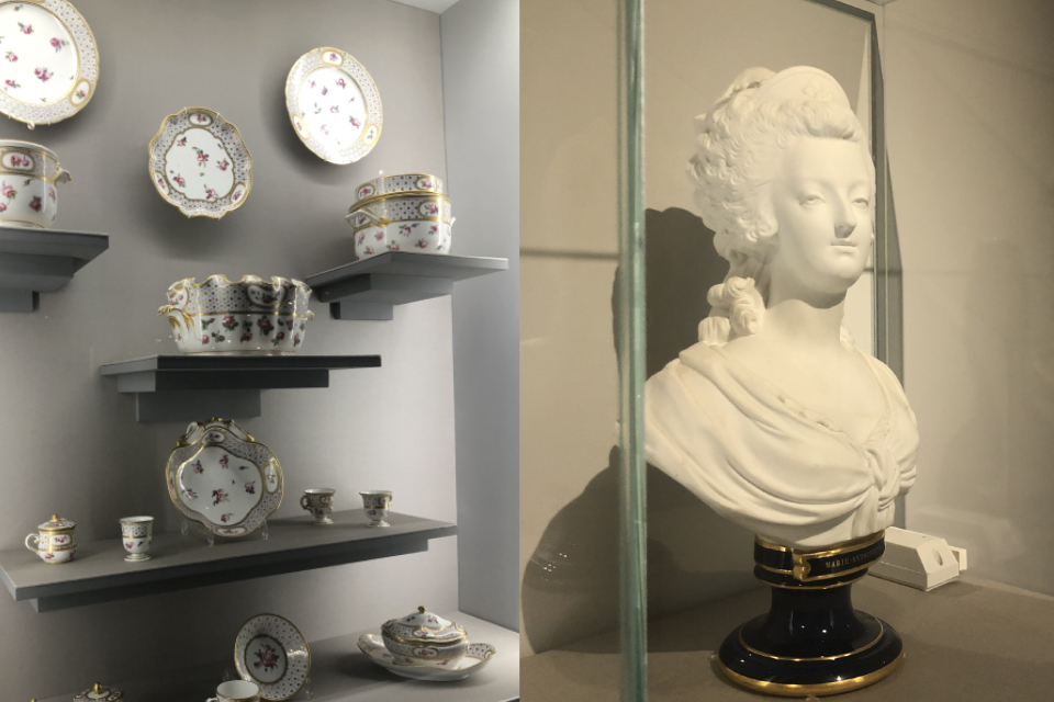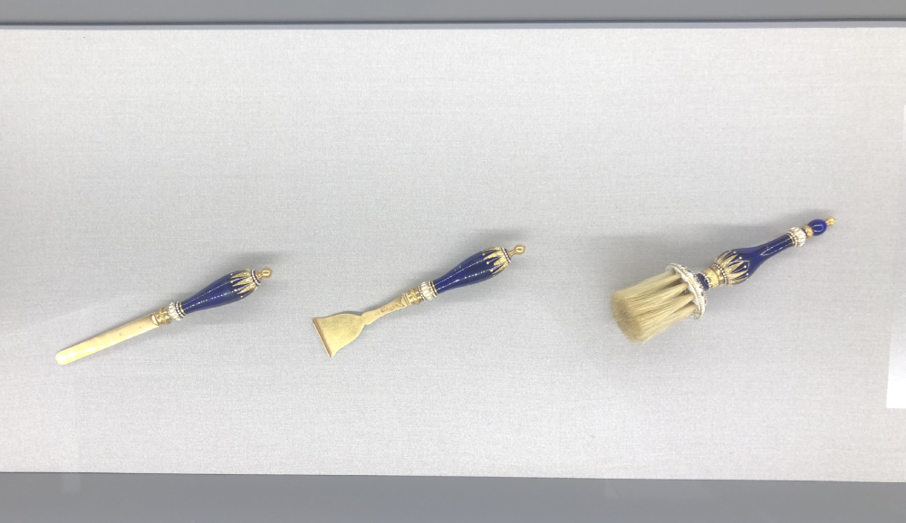 Там же «прописан» и изящный туалетный прибор. В Москву приехала лишь часть его. Другая хранится под колпаком и не покидает музей. Туалетный прибор преподнесли Марии Федоровне во время визита в Севр. Всего в приборе было 60 предметов! В Москве можно увидеть лишь 7, в том числе лопатку для чистки языка.