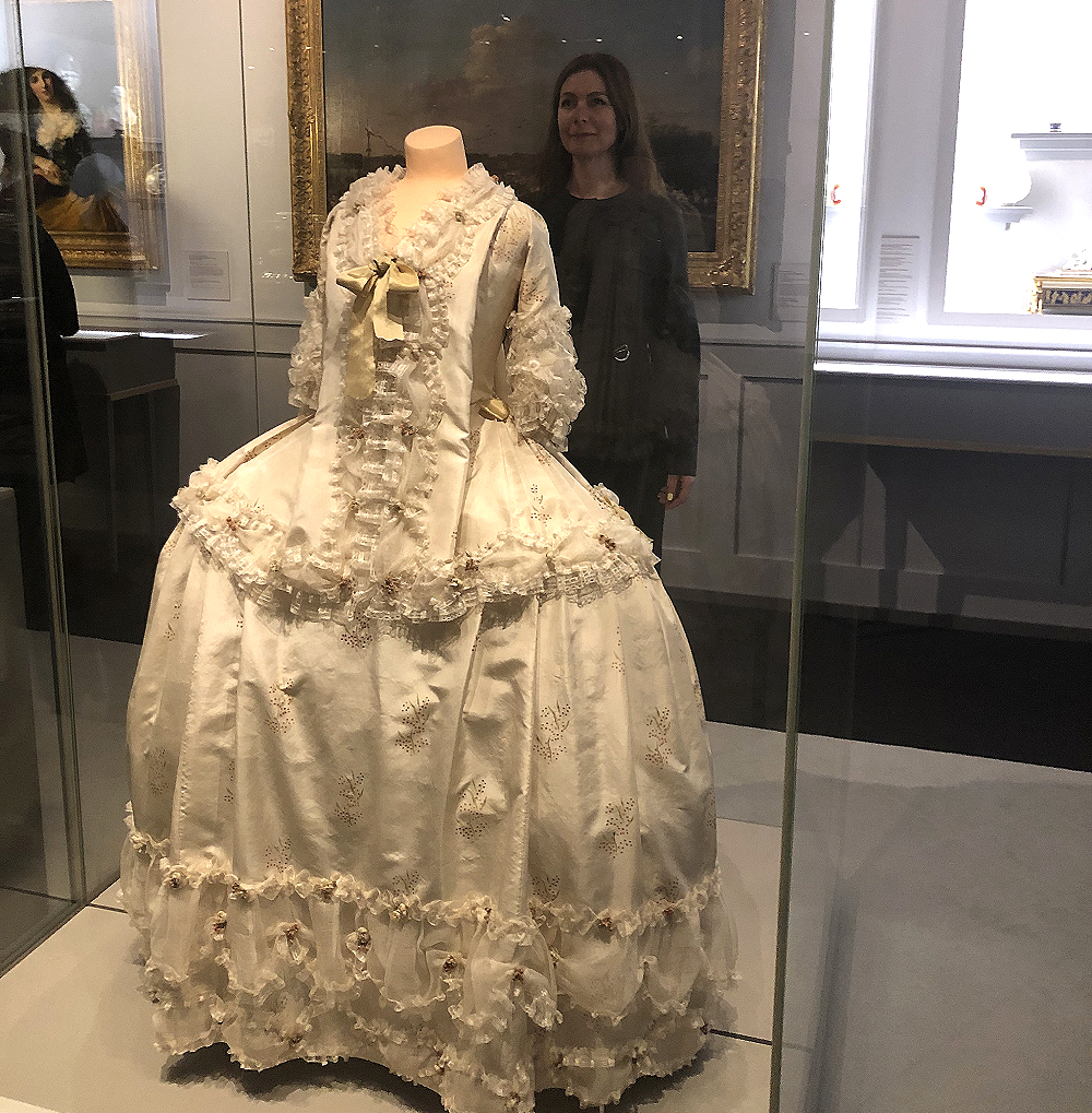 Продолжается выставка в другом зале. Там взгляд посетителей сразу приковывает изящное платье. Оно принадлежало Марии Федоровне, супруге Павла I. После женитьбы они под вымышленными именами графа и графини Северных отправились в Париж. Там у пары было немало встреч, в том числе и на высшем уровне. С Марией Антуанеттой у них сложились настолько теплые отношения, что Мария Федоровна воспользовалась услугами г-жи Бертен. Модистка королевы сшила ей домашнее платье, состоящее из шелковых пеньюара и юбки, расписанной акварелью. Это платье было получено из Парижа 25 июня 1784-м году.
