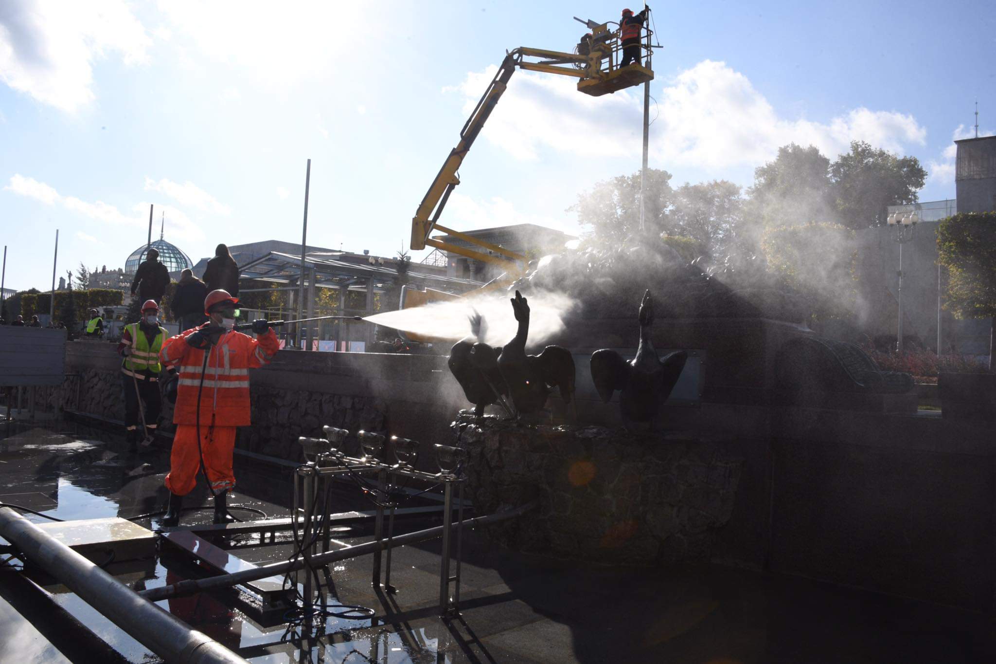 – Мы промыли фонтан и элементы декора. Для выполнения работы потребовалось 20 сотрудников. После консервации еще осмотрим светильники, проверим работу насосов, — делился Павел Омельченко.