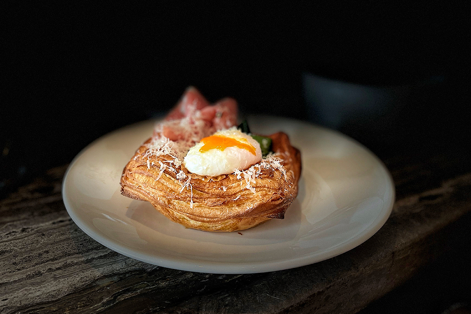 Еще очень достойный вариант — слоеное тесто с мортаделлой и яйцом пашот (450). По виду не скажешь, но на самом деле мортаделлы там довольно много, и это, конечно, хорошо, ибо мортаделла по утрам — штука весьма приятная. Такие же слойки есть еще с беконом и лососем (цена та же).